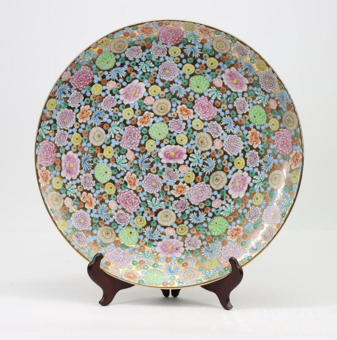 SoldFine Japanese Gilt Porcelain Charger 18''. IntricateFine Japanese Gilt Porcelain Charger 18''. Intricate polychrome enameling with vast mountainous landscape and millefleur floral border. Gilt blossoming cherry tree branch on verso. Excellent conditionSee Sold Price