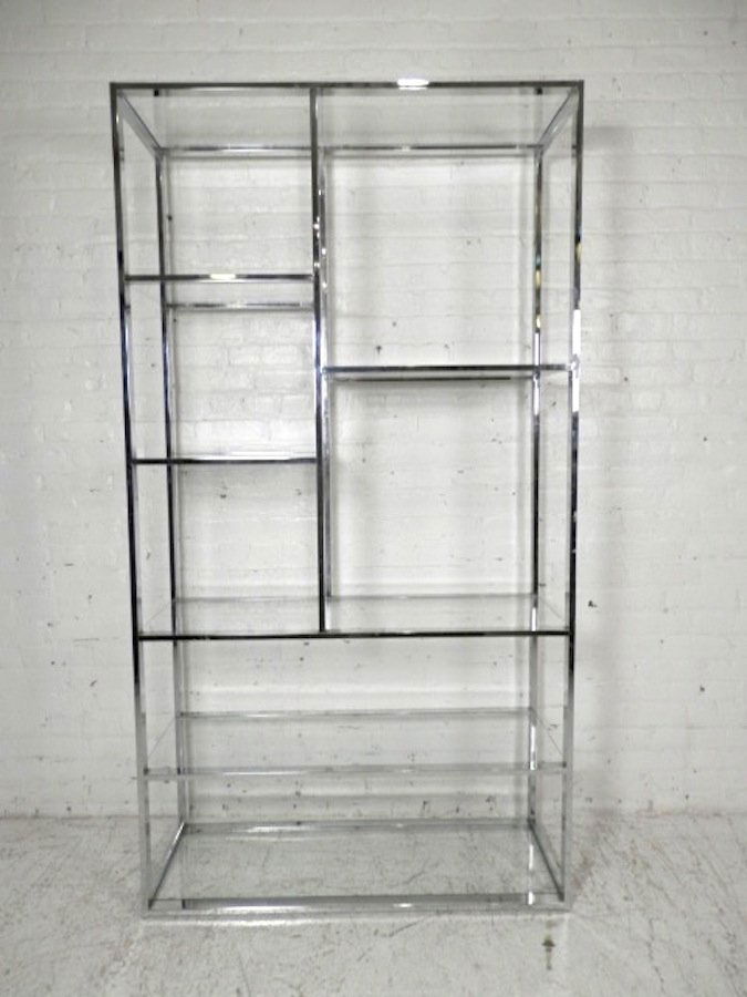 SoldMilo Baughman Style Chrome EtagereMilo Baughman Style Tall Chrome Etagere, with six glass shelf insert, unmarked. 79" H x 32" W x 12" D. Provenance: From a New York City Collection. Keywords: Modern Furniture, Bookshelf, Bookcase, SheSee Sold Price