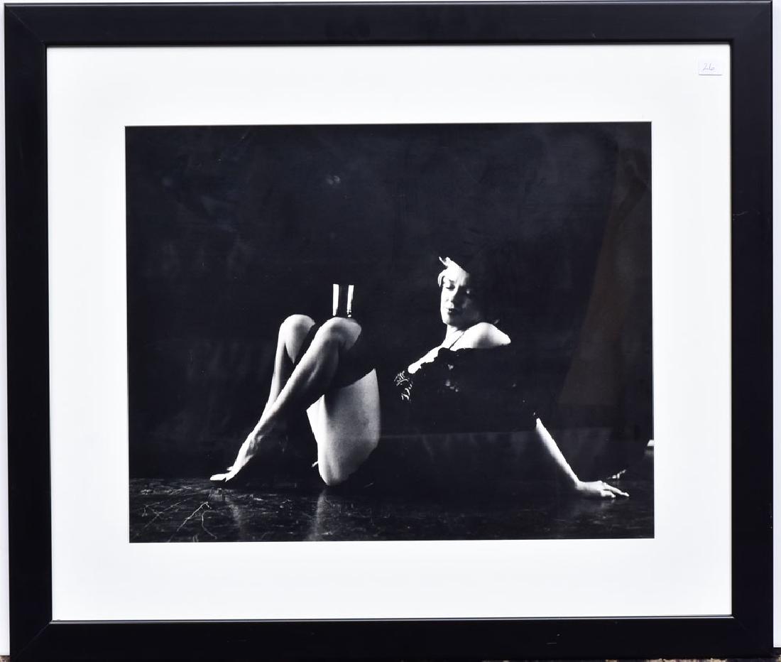 SoldPhotograph of Marilyn Monroe by Milton H. Greeneblack and white photograph by Milton H. Greene capturing Marilyn Monroe reclining on stage floor, exuding elegance and charisma in a candid style.See Sold Price