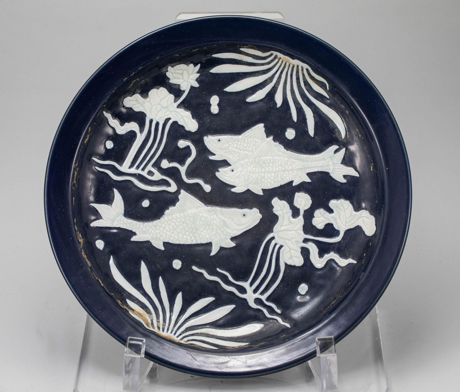 Ming Dynasty Blue Glazed Fish and Algae Plate