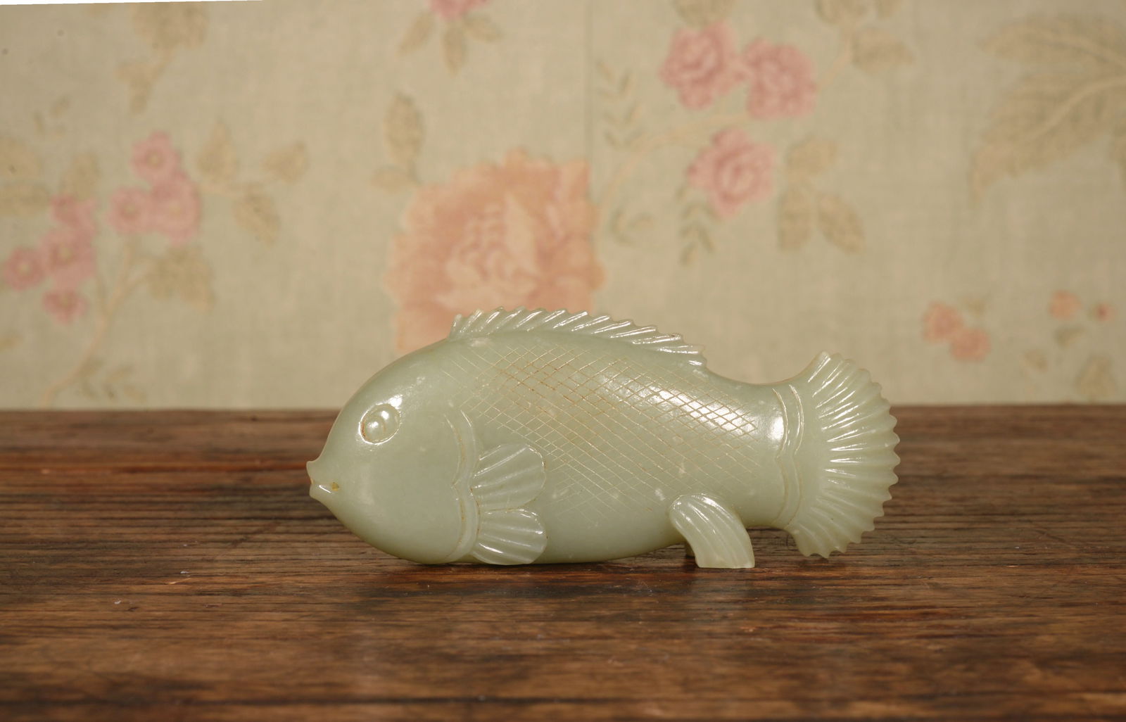 SoldMING DYNASTY JADE CARVED FISH ON STANDLarge Chinese Ming carved fish on a hardwood stand. Compressed ovoid form with carved tail, scales, and face details along with tendrils and water foliate across the body in incredible delicately detaSee Sold Price