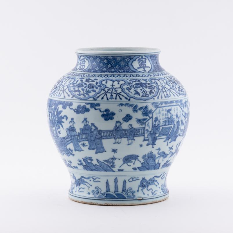 SoldCHONGZHEN BLUE AND WHITE PORCELAIN FIGURE JAR, MINGCHONGZHEN BLUE AND WHITE PORCELAIN FIGURE JAR, MING DYNASTY, CHINA H. 30 cm.See Sold Price