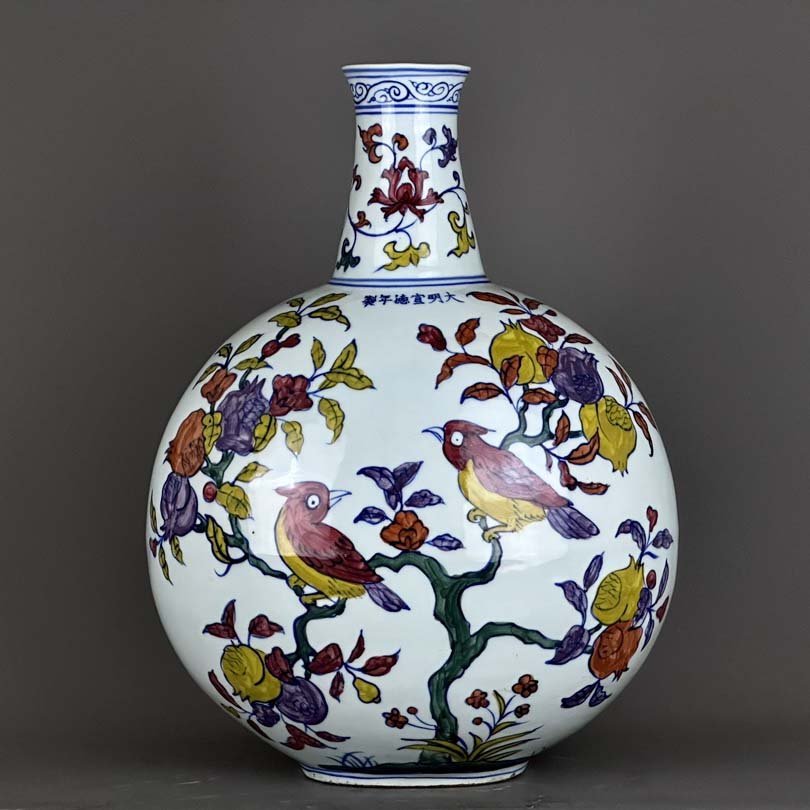 Ming Xuande multicolored flower and bird pattern flat vase