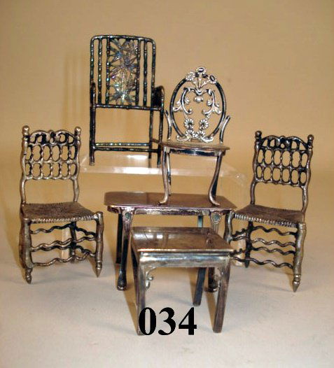 SoldMiniature Sterling Silver Pieces on Two Tables.The tallest piece is a vase 2-1/2" tall. The first round table has three pieces of sterling silver that are very special by their design and form. The larger table shows 14 pieces of sterling silver �See Sold Price