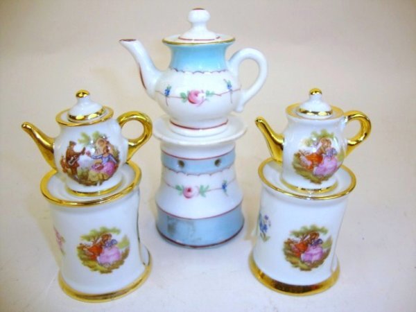 SoldA group of three satsuma miniature teapots with attached handlesA group of three satsuma miniature teapots with attached handles decorated in gold and colored enamels with flowers all around.Each artist signed.Tallest 2 1/2 inches.(One lid glued , see photograph).See Sold Price