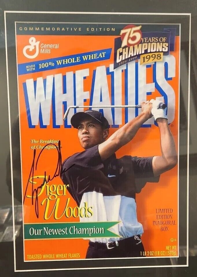 SoldTiger Woods auto Wheaties BoxThis is a hand signed / autographed Wheaties box with holder. This has been signed by PGA Legend and superstar Tiger Woods. This has been certified and authenticated by Authenticated Ink (AI) #J503791See Sold Price