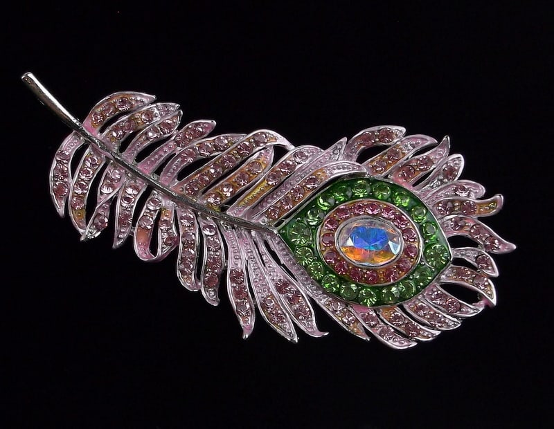 Mint Enameled Rhinestone Peacock Feather Brooch