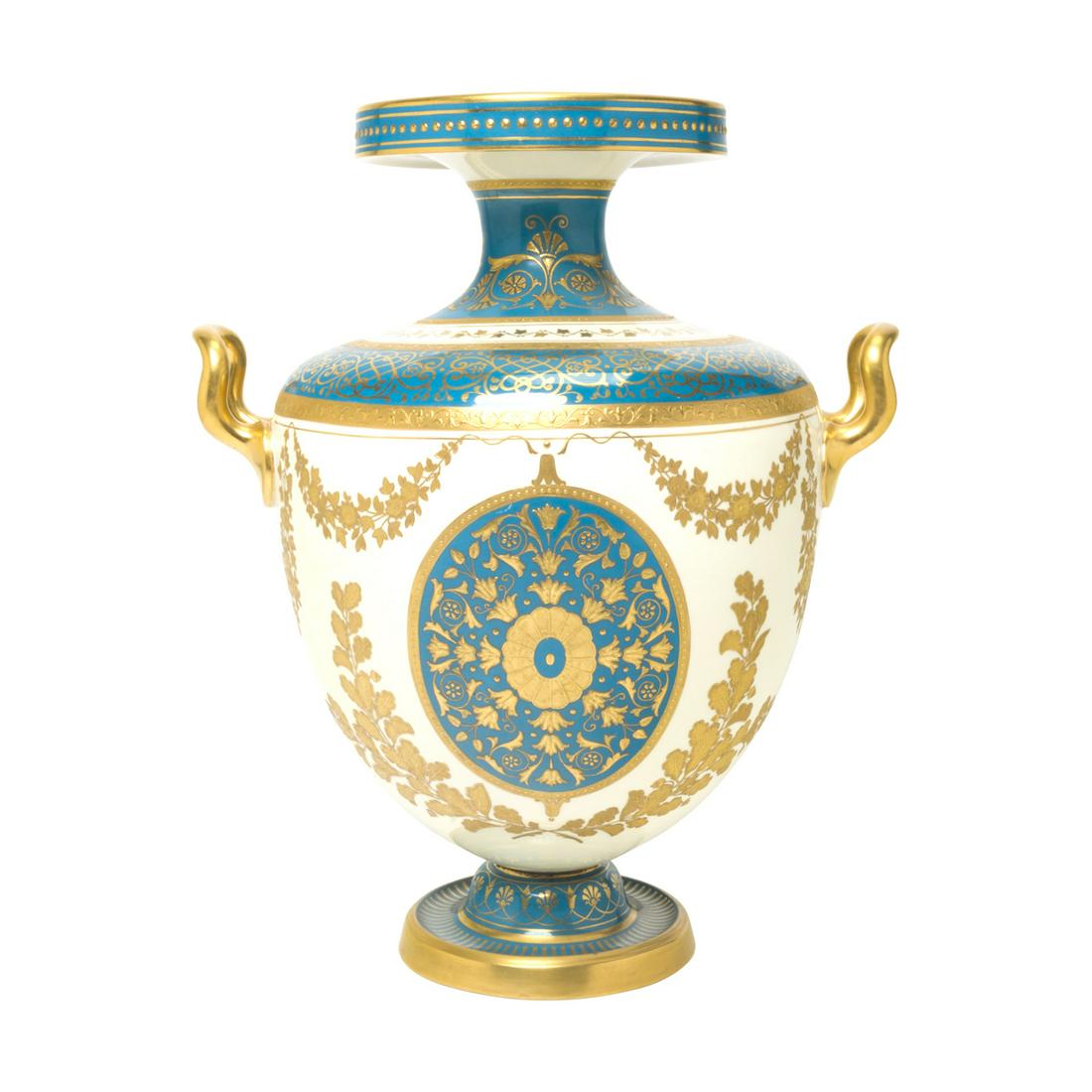 Minton Attributed Egyptian Influence Two Handled Urn.