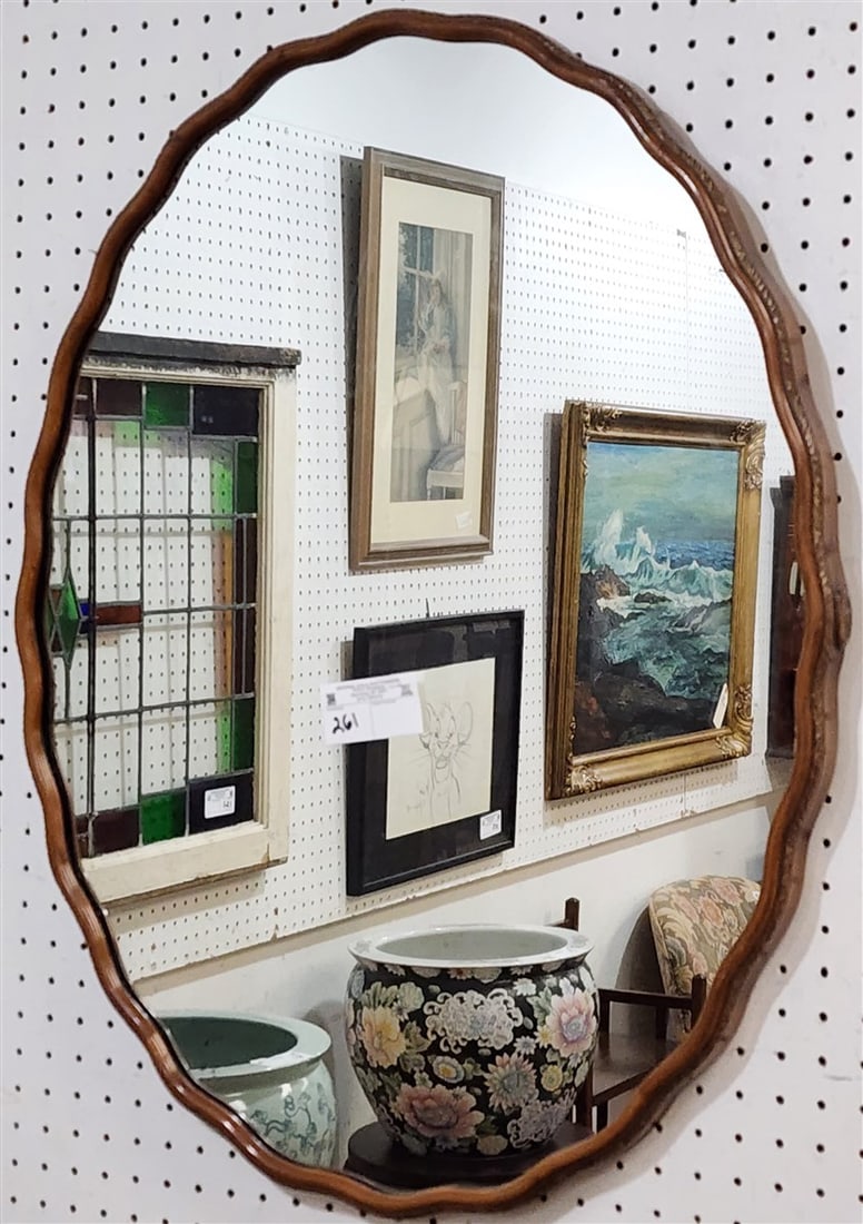 SoldBeveled MirrorGold painted oval wooden framed beveled wall hanging mirror 23"h x 30"w State wide delivery is available for this item. Please email shipping@vogtauction.com or call 210-822-6155 for a quote. IN-See Sold Price