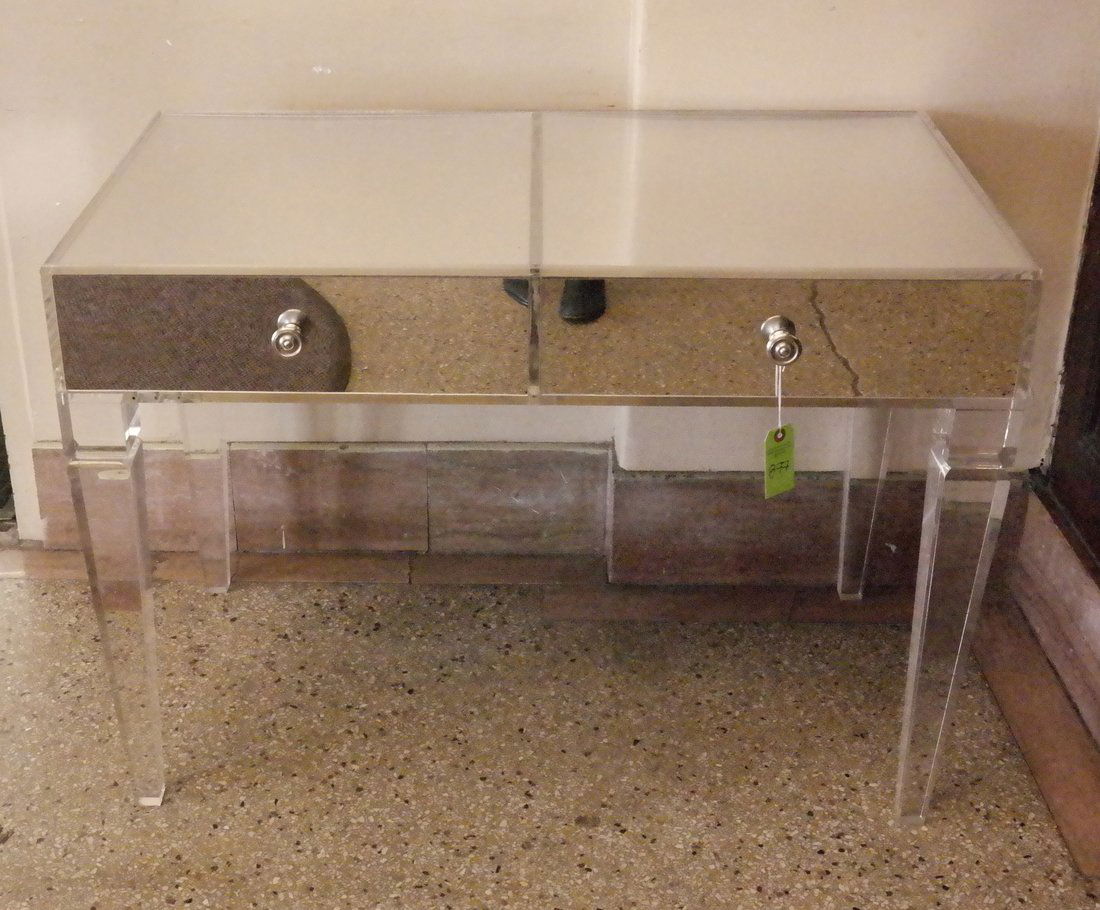 Sold1940'S VENETIAN ART DECO MIRRORED DRESSING TABLEDimensions: H 66" x W 43.5" x D 15" Condition: Cracks and one loss to glass at drawer fronts; some minor de-silvering to mirror finish; a few chips to glass edges.See Sold Price