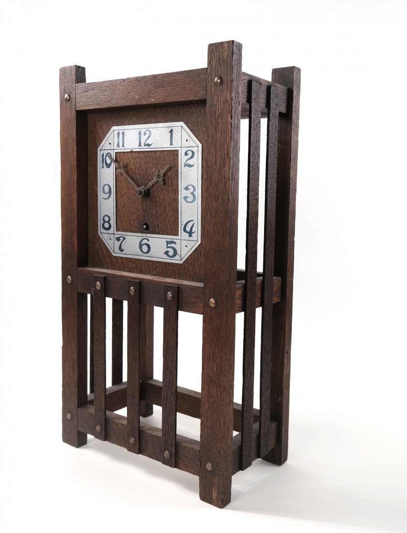 SoldCirca 1910 Sessions Mission Oak Arts and Crafts Mantle Clock 18 in. height x 12.5 in wideCirca 1910 Sessions Mission Oak Arts and Crafts Mantle Clock 18 in. height x 12.5 in wide. size: 18x12.5x5.25 Shelf: ESee Sold Price