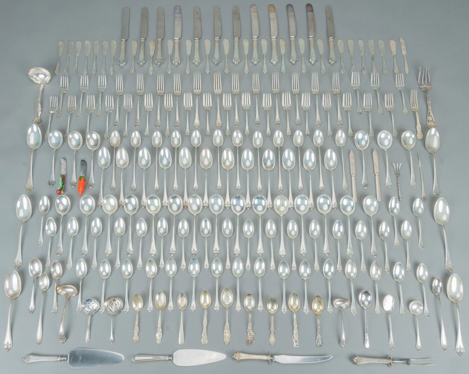Lot Of Antique Sterling Silverware 513g Total2 days LeftLot of Sterling Silver Flatware Pieces, 54.07 Troy OuncesMar 14, 2026Lot of Assorted Coin Silver Pieces, 29.89 Troy OuncesMar 14, 2026Lot of silver utensils. To include: continental lion handle spoon, shaped bowl serving spoon,Mar 01, 2026Large lot of sterling silver and silver handled utensils. To include: Durgin serving fork and spoonMar 01, 2026Collection Handsome Sterling Silver Flatware SetsFeb 28, 2026Towle Sterling Silver Flatware ServiceFeb 28, 202665pc Silverplate Flatware and ServingMar 02, 2026(103) AMERICAN LUNT 'MARY II' STERLING SILVER FLATWARE SERVICE3 days Left(40) COLLECTION OF STERLING SILVER & MOTHER-OF-PEARL FLATWARE3 days LeftFifty one American, English and French Sterling flatware and Serving Pieces1 day LeftSterling Silver Flatware Service, Damask Rose PatternFeb 28, 2026800 silver cutlery set7 days Left71-Piece Sterling Silver .925 Flatware SetWHITING MFG STERLING SILVER FLATWEAR SET4 days LeftA MATCHED SILVER OLD ENGLISH PATTERN PART TABLE SERVICEMar 03, 2026