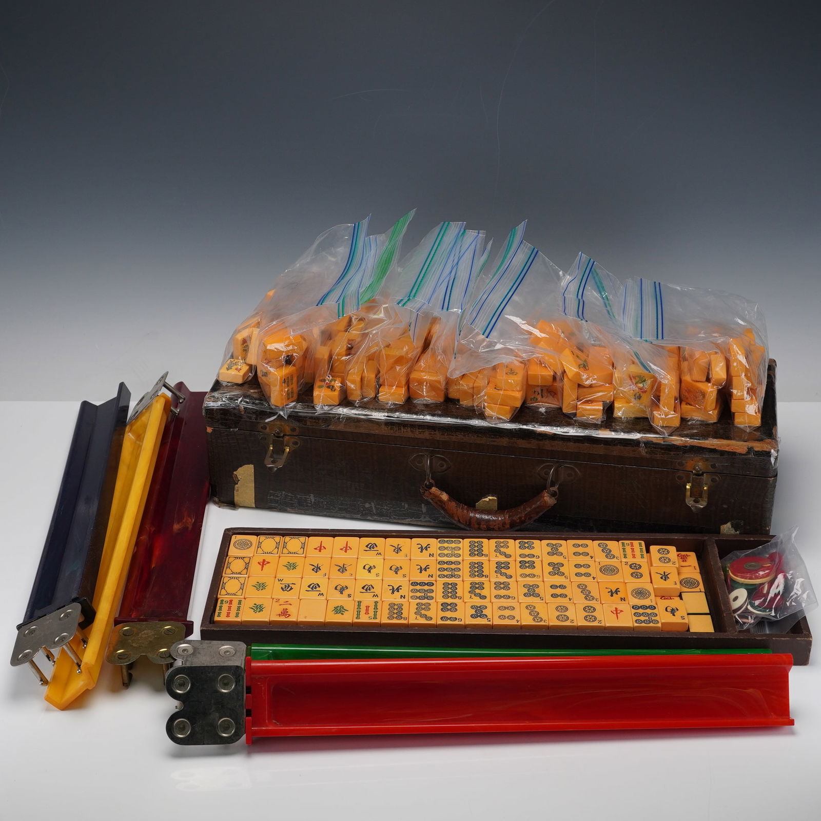 Mixed Mahjong Tile Sets in Brown Case with Accessories