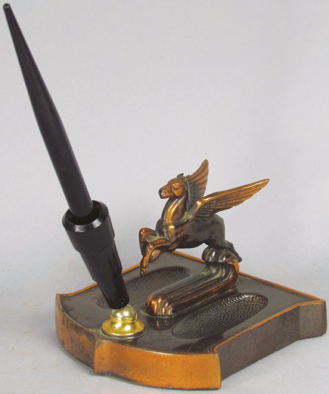SoldGENERAL PETROLUM PEGASUS FOUNTAIN PEN HOLDERIN GOOD CONDITION, HAS MINOR SPOTS ON TOP, MISSING HOLDER FOR THE PEN, 4.5"X6"X5", RATED 8.5See Sold Price