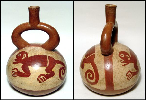 Moche Phase III stirrup vessel with monkeys