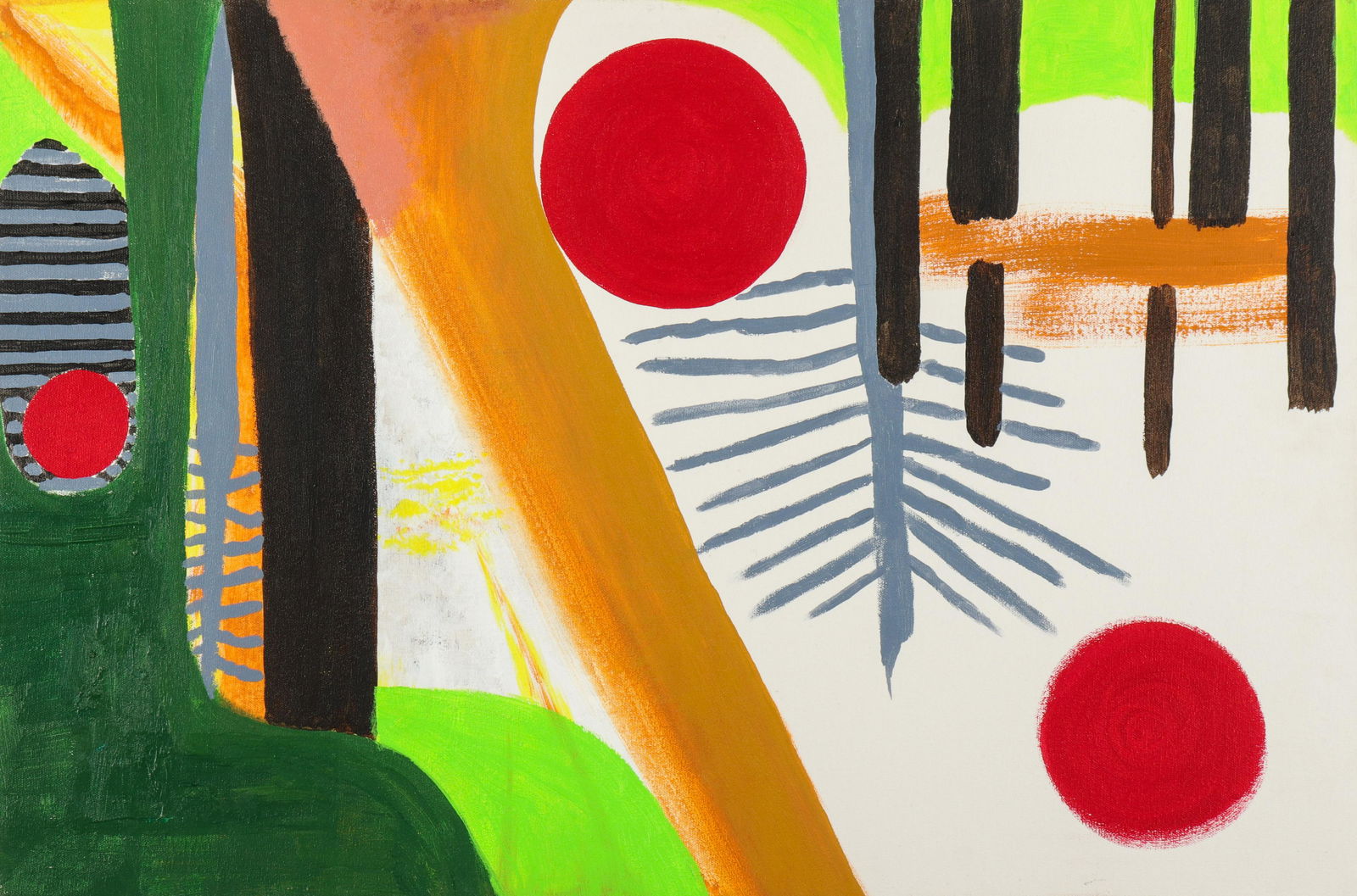 Sold"Modern Abstract" Acrylic on CanvasModern abstract painting depicting biomorphic forms in orange, magenta and ochre with two red discs on a black field, acrylic on canvas. 30" H x 40" W.See Sold Price