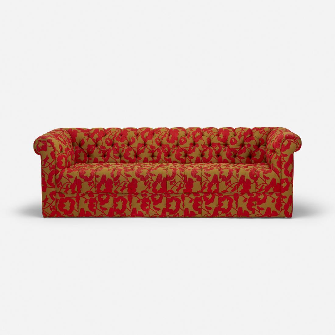 SoldMid-century Modern sofa, Chesterfield styleMid-century Modern, sofa, Chesterfield style, USA, 1970s, brown upholstery with tufting, chrome ball feet, newly reupholstered, 100"w x 36"d x 27.5"hSee Sold Price