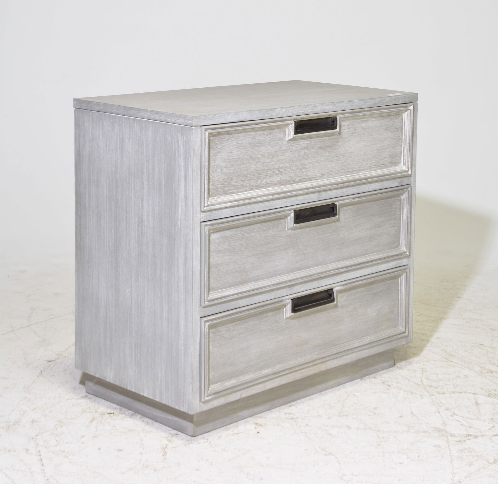 SoldMid Century Modern Three Drawer Chest CommodeSwedish style end table, night table, commode, side table with straight legs and layered washed painted finish, reads as gray tone. Measures 25-1/2 x 31 x 15 in inchesSee Sold Price