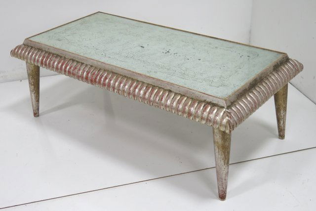 SoldITALIAN STYLE MIRROR TOP COFFEE TABLECarved base with distressed mirror top. Dimensions: H 15.5" x W 55" x D 25.5" Condition: Few small nicks to glass top. Some paint losses to base.See Sold Price
