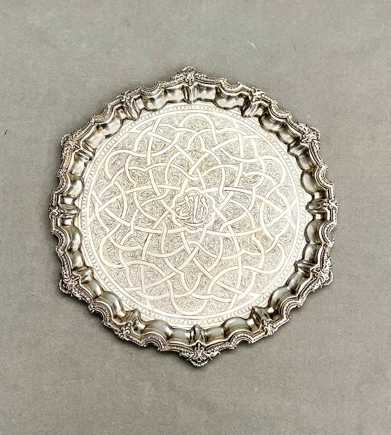 SoldEGYPTIAN SILVER CHIPPENDALE-STYLE SALVER , - D: 11 1/8 in.; Wt. 17.4 troy oz.EGYPTIAN SILVER CHIPPENDALE-STYLE SALVER . Serpentine edge decoration; center with overall floral and strapwork decoration - D: 11 1/8 in.; Wt. 17.4 troy oz.See Sold Price