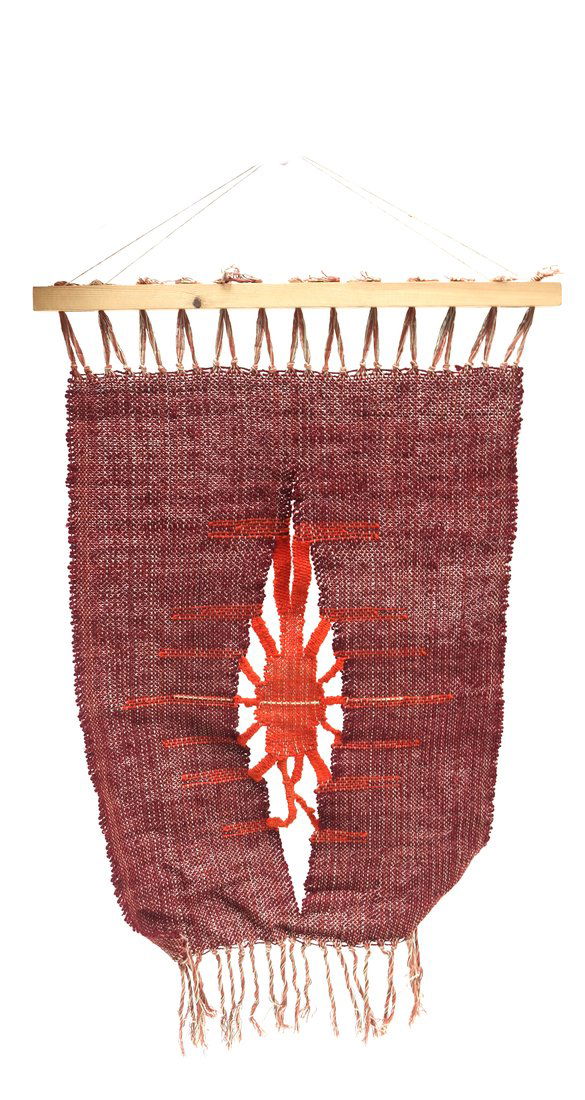 SoldMID-CENTURY MODERN Textile Art Wall HangingA Mid Century Modern woven textile art wall hanging made by Arte Mexicano. Label on verso.Measures: H: 39" x W: 11" x D: 2" Can be rolled or folded for more compact shipping.See Sold Price