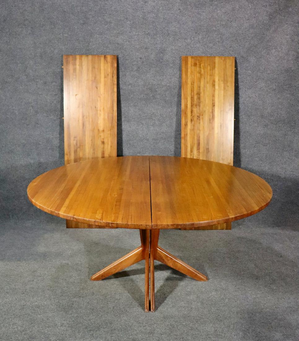 SoldMid-Century Modern Walnut Dining TableMid-century Modern walnut dining table with three leaves. [30" H x 44" Diam.; Leaves: 12" W (x3)]. Minor scratches and wear as with age.See Sold Price