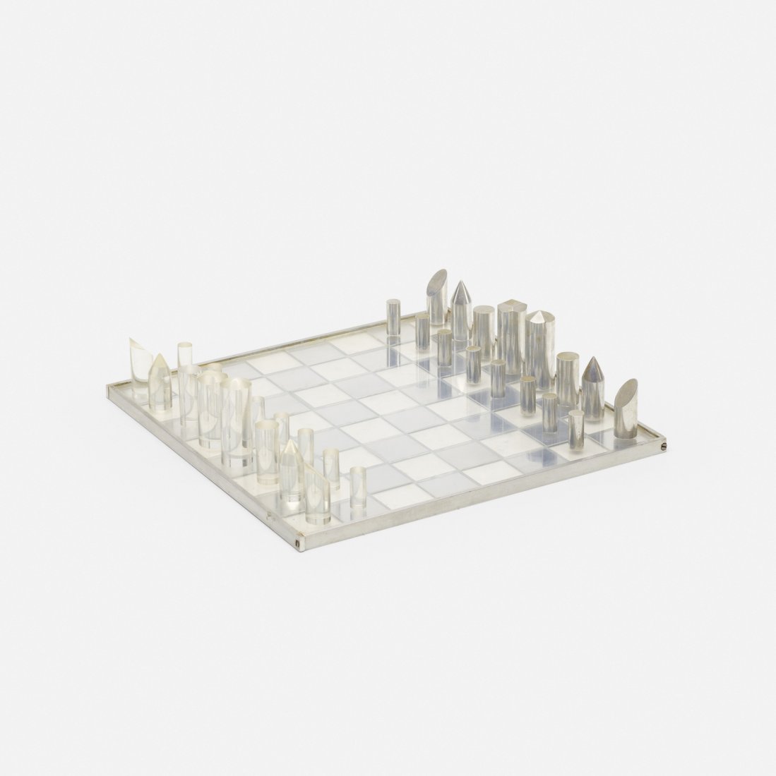 SoldAUSTIN COX "ALCOA" MODERNIST CHESS SET.Austin Cox / Austin Enterprises for ALCOA chess set. USA, circa 1962 aluminum, acrylic, faux-wood laminateimpressed manufacturer's mark to underside of each piece '1962 Austin Enterprises' includes orSee Sold Price
