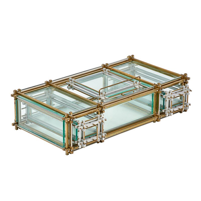 QUALITY NICKELED BRASS COFFEE TABLE BASE WITH THICK GLASS TOP C 1965. TOP APPEARS TO HAVE AKamelot Auctions4.4(345)$4007 days Left