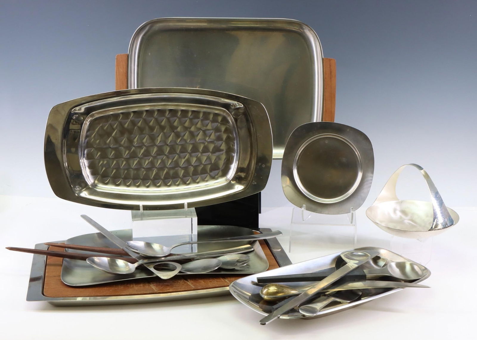 SoldDANISH MID-CENTURY DECORATIVE TABLEWARE GROUPINGIncluding (2) Jens Quistgaard Dansk teak serving trays, a set of (3) nesting serving bowls stamped Ebilin Denmark, and (2) modernist stainless steel candle holders marked Lundtofte. Dimensions: (LargeSee Sold Price