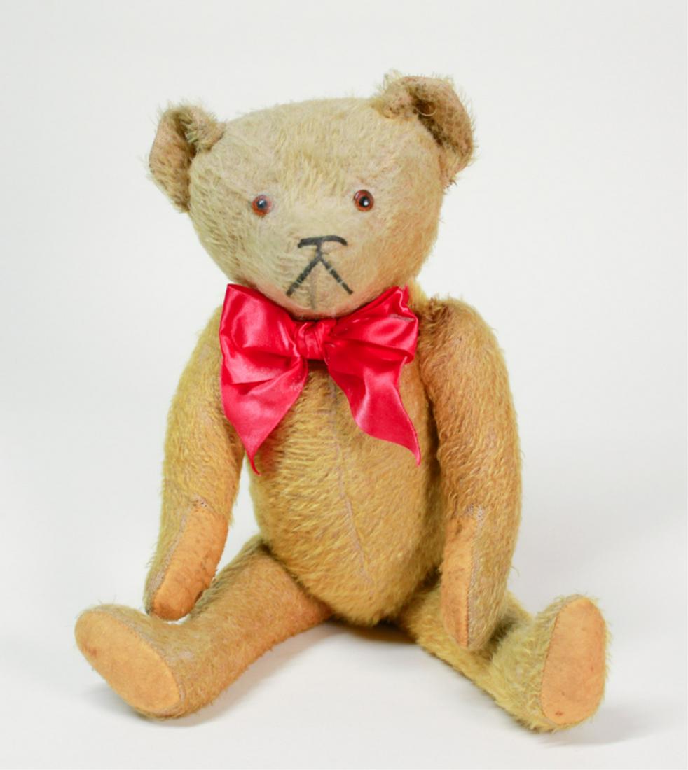 SoldAntique Steiff Blonde Mohair Teddy Bear.Antique Steiff Blonde Mohair Teddy Bear. Unsigned, circa 1908-1909. 5-way jointed with shoe button eyes. 12"h.See Sold Price