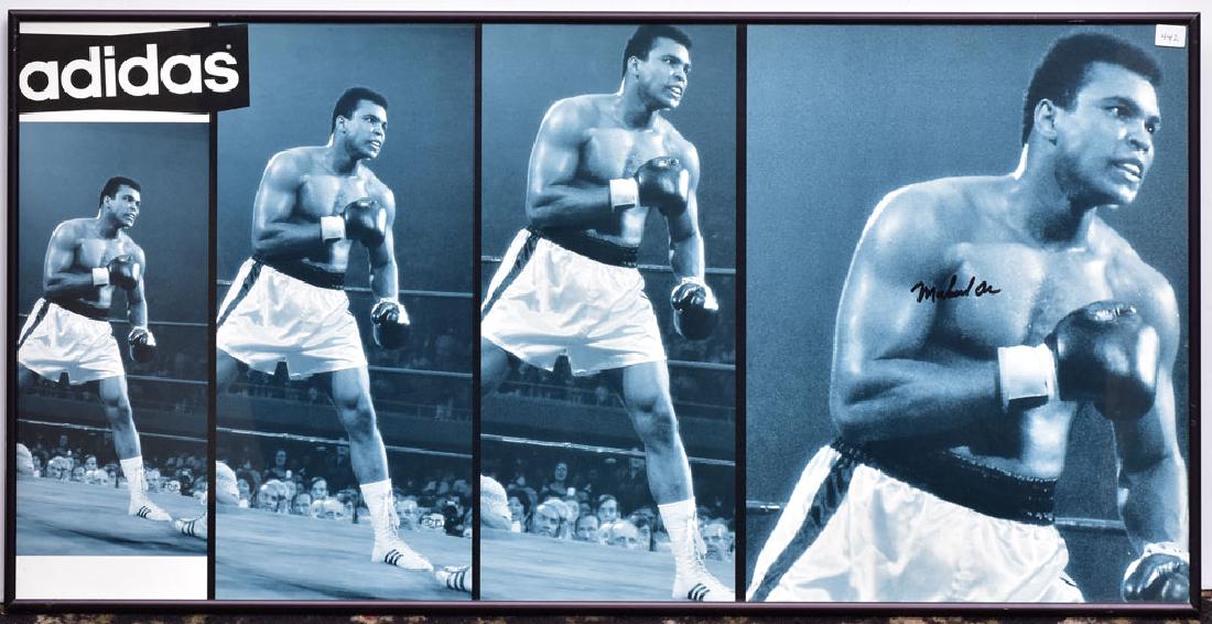 SoldFramed Signed Mohammad Ali PosterFramed signed Muhammad Ali poster, Ali knocks out Liston, signed (middle right) in silver marker, matted, sit = 22 1/2" x 28 1/2" in silver wood 31" x 36 1/2" frame, no Certificate of Authenticity, CoSee Sold Price