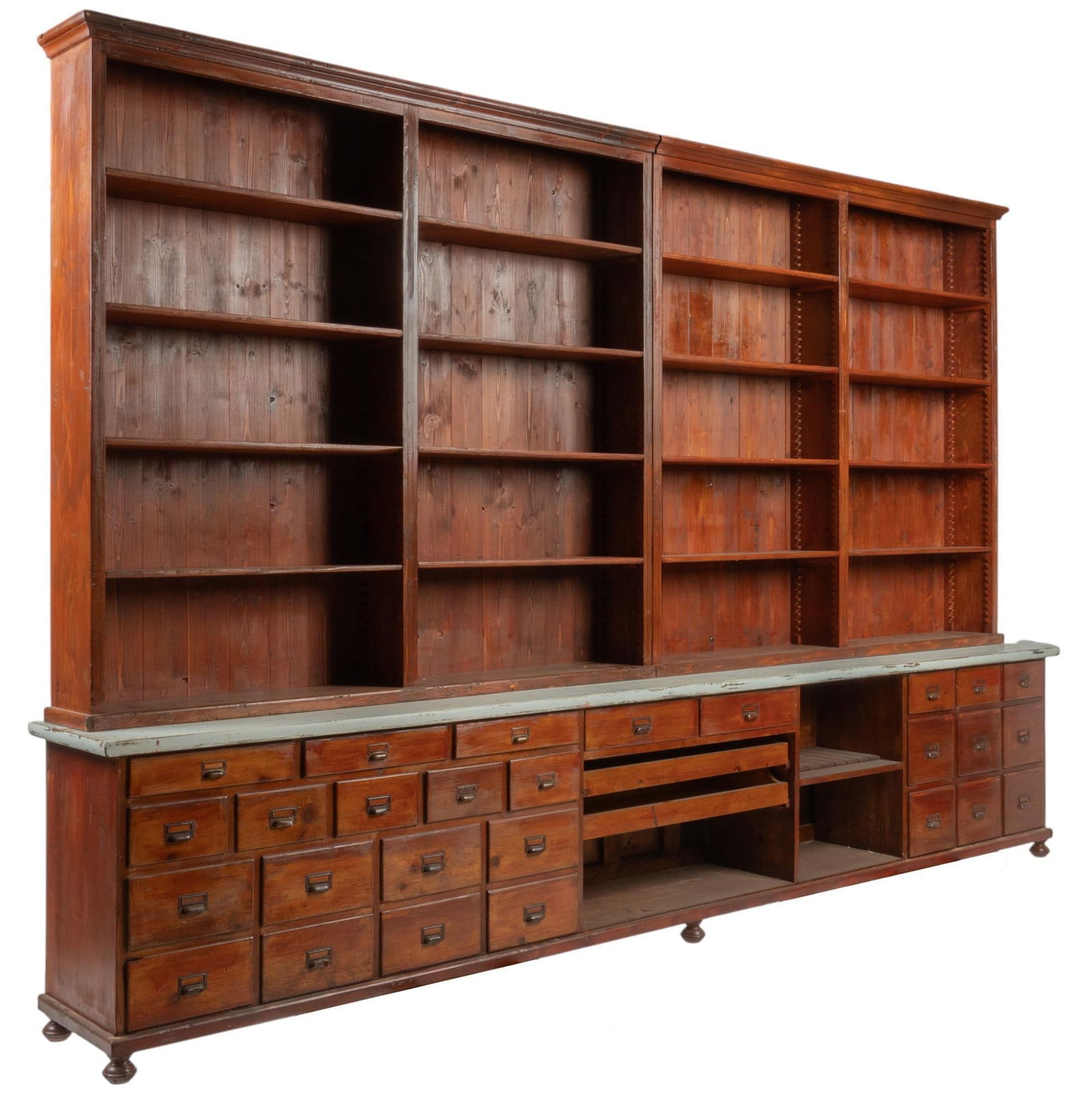 SoldMonumental General Store Display CabinetMonumental general store display cabinet, twenty-two drawers below open shelves, two glazed doors, paint remnants, porcelain accents, rising on bun feet 119"h x 139"w x 14.5"d We happily provide seaSee Sold Price