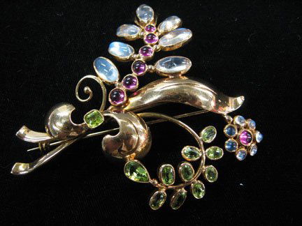 Moonstone, peridot and ruby spray brooch, , Flowe