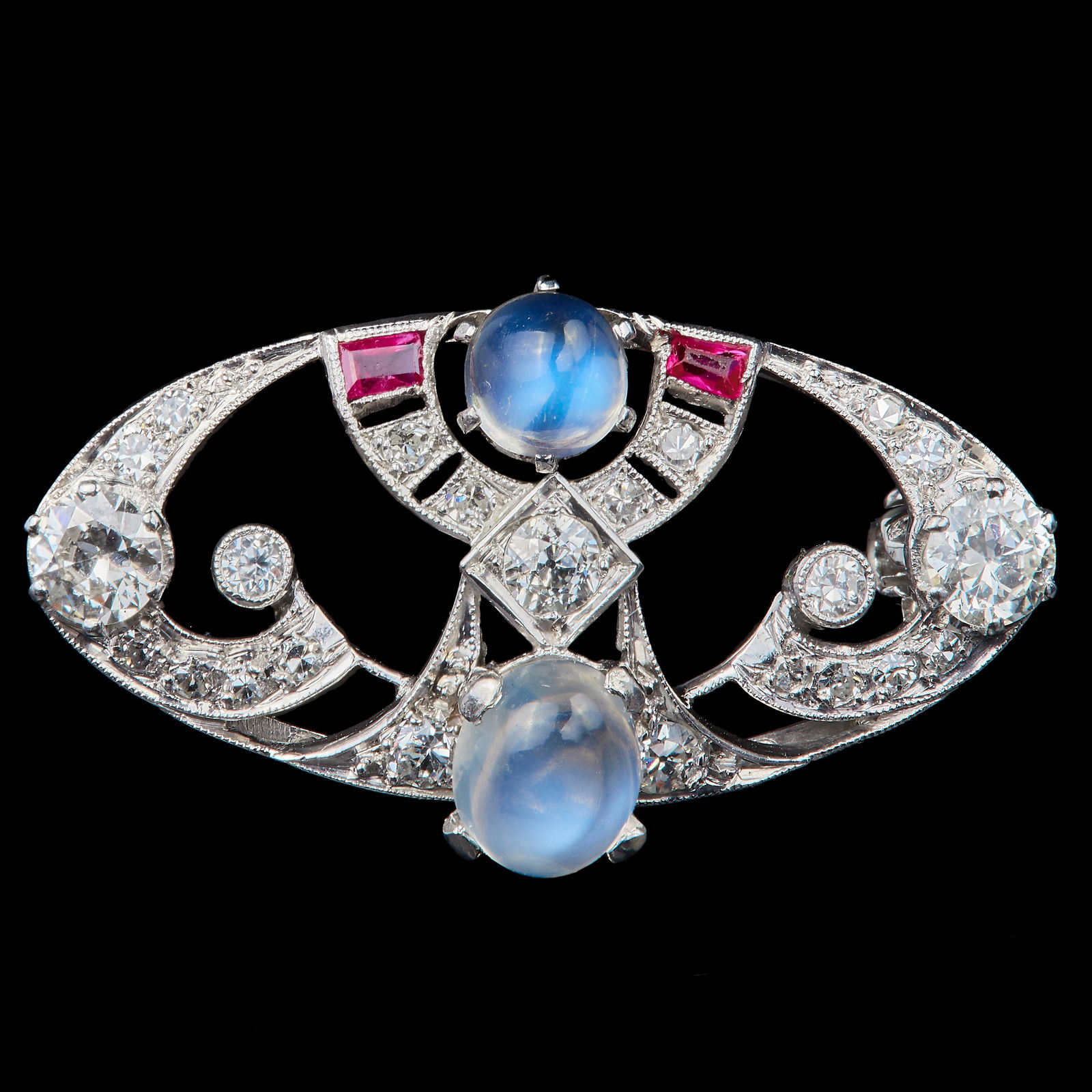 MOONSTONE, RUBY AND DIAMOND BROOCH