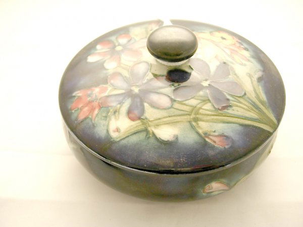 Moorcroft covered dish, measures 4 1/4" d.