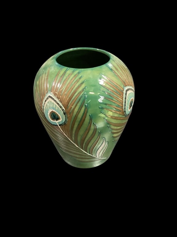 SoldWilliam Moorcroft Peacock Feather Vase (Sally Tuffin)Sally Tuffin for Moorcroft PEACOCK FEATHERS pottery vase, made for Liberty. Peacock feathers pattern, decorated with tubelined feathers against a green ground. Signed LIBERTY with painted monogram ofSee Sold Price