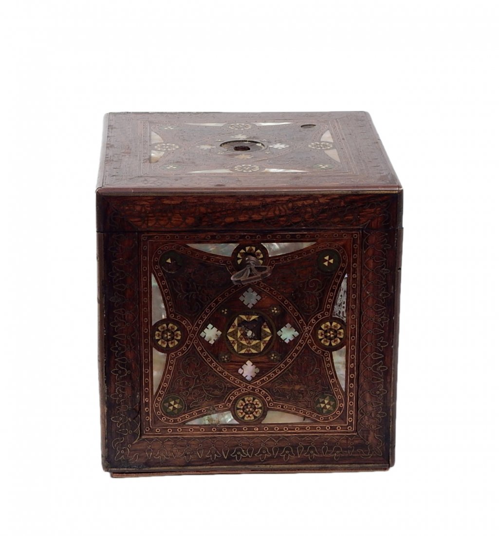 SoldMoorish Style Inlaid BoxMoorish Style Inlaid Box. Mother of Pearl inlay. Size: 6 1/4 x 4 1/4 x 2 1/4 in.See Sold Price