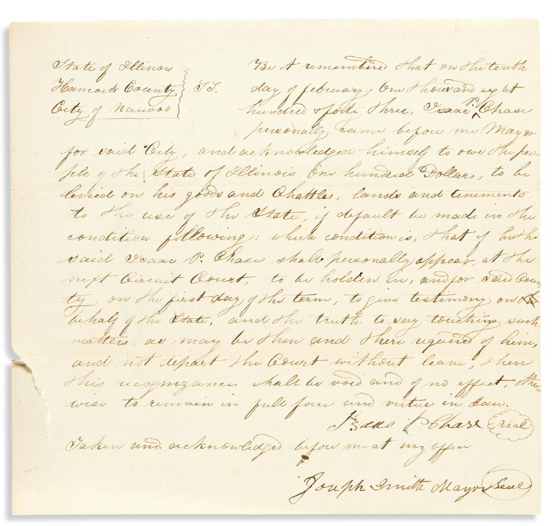 (MORMONS.) SMITH, JOSEPH. Document Signed, "Joseph