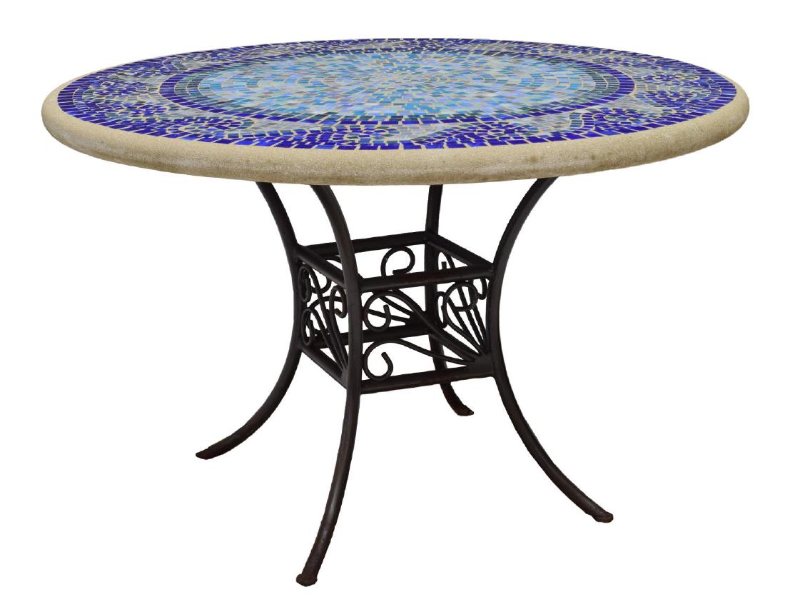 SoldCalifornia Mosaic Circular Tile Top Table with Rounded Tile Perimeter on an Iron BaseCalifornia Mosaic Circular Tile Top Table with Rounded Tile Perimeter on an Iron BaseTeal ground and sides centering a star form mosaic multi-colored central medallion, on scrolling iron base.DiameterSee Sold Price