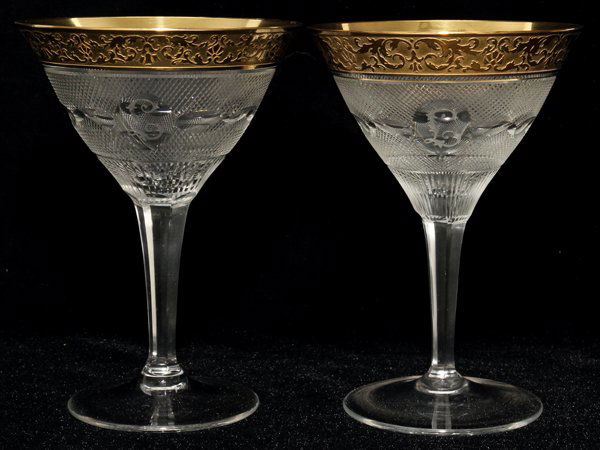 Sold12 Moser Czech Cut Crystal Glass Martini Tall Sherbet Goblets Gold Splendid12 Moser Czech blown cut crystal glass martini tall sherbet goblets in Gold Splendid. Gold encrusted foliate leaves to top rim. Frosted engraved crosshatched exterior with horizontal thumbprint circulSee Sold Price