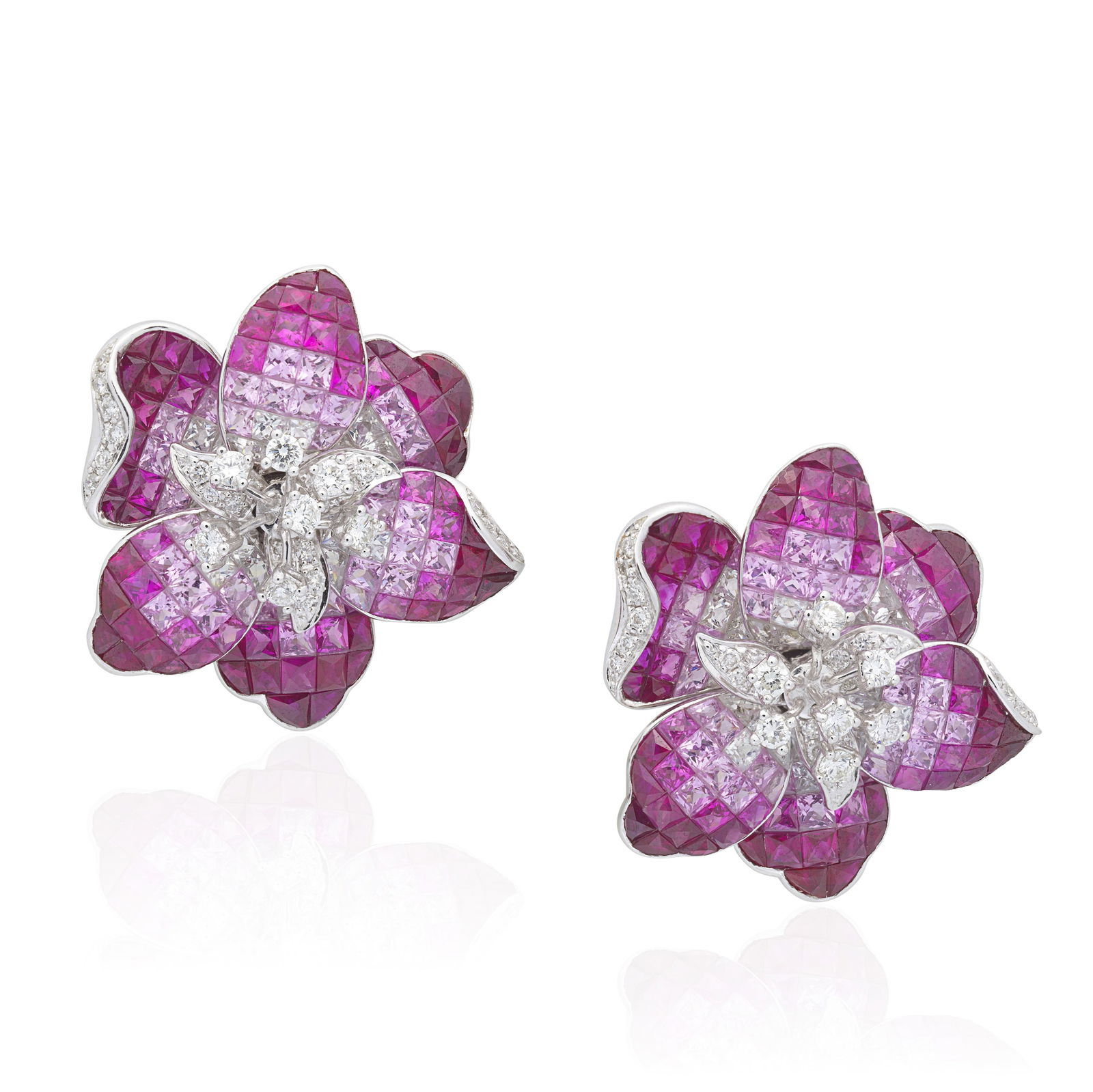 MOUSSAIEFF: RUBY, SAPPHIRE AND DIAMOND FLOWER EARRINGS