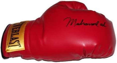 SoldMuhammad Ali Autographed Boxing Glove in DisplayMuhammad Ali Autographed Boxing Glove In Display Case Well Preserved Full Size 16 Oz Left Hand Red Everlast Boxing Glove With Yellow & Black Everlast Tag. The Glove Has Been Signed by The Former WorldSee Sold Price