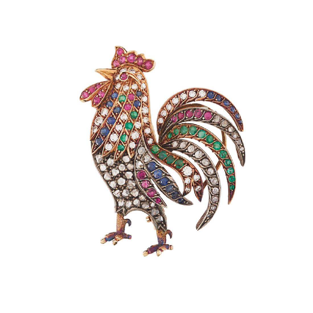 MULTI GEM-SET YELLOW GOLD COCKEREL BROOCH