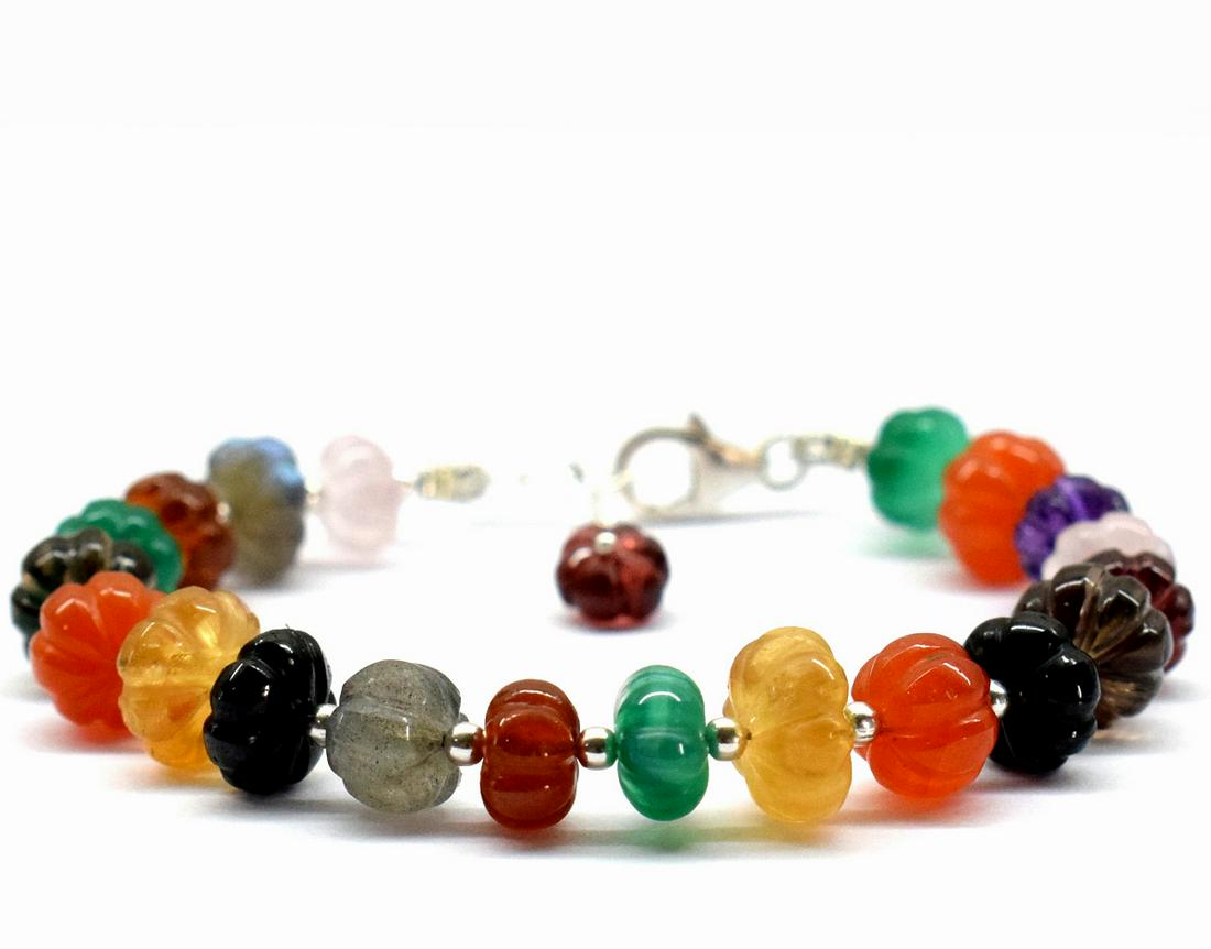 MULTI GEMSTONE MELON CARVED BRACELET W/ 925 SILVER