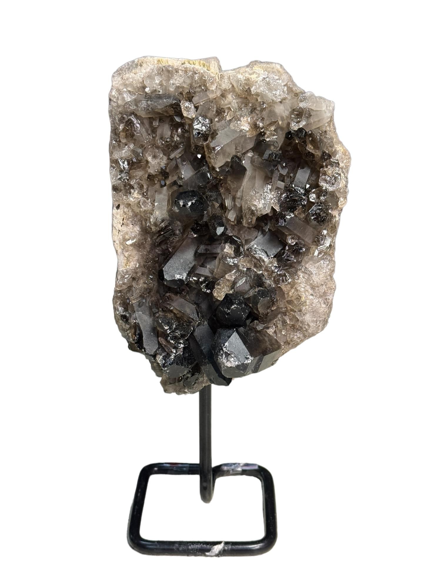 SoldAmethyst and Agate Cluster with Smoky Quartz on StandAmethyst and agate cluster with smoky quartz on black metal stand. 9.5" x 4.75" x 3.25". 5.4 pounds.See Sold Price