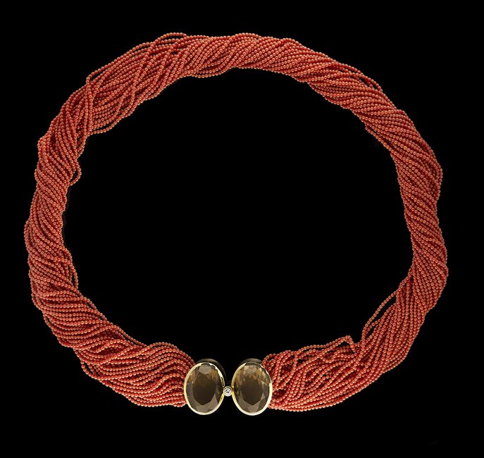 SoldMulti-Strand Red Coral Necklace w/ 14K Gold ClaspMulti-Strand Red Coral Necklace w/ 14K Gold Clasp, Form a California Estate_x000D_ Dimension: 120 grams, 20 inches lengthSee Sold Price