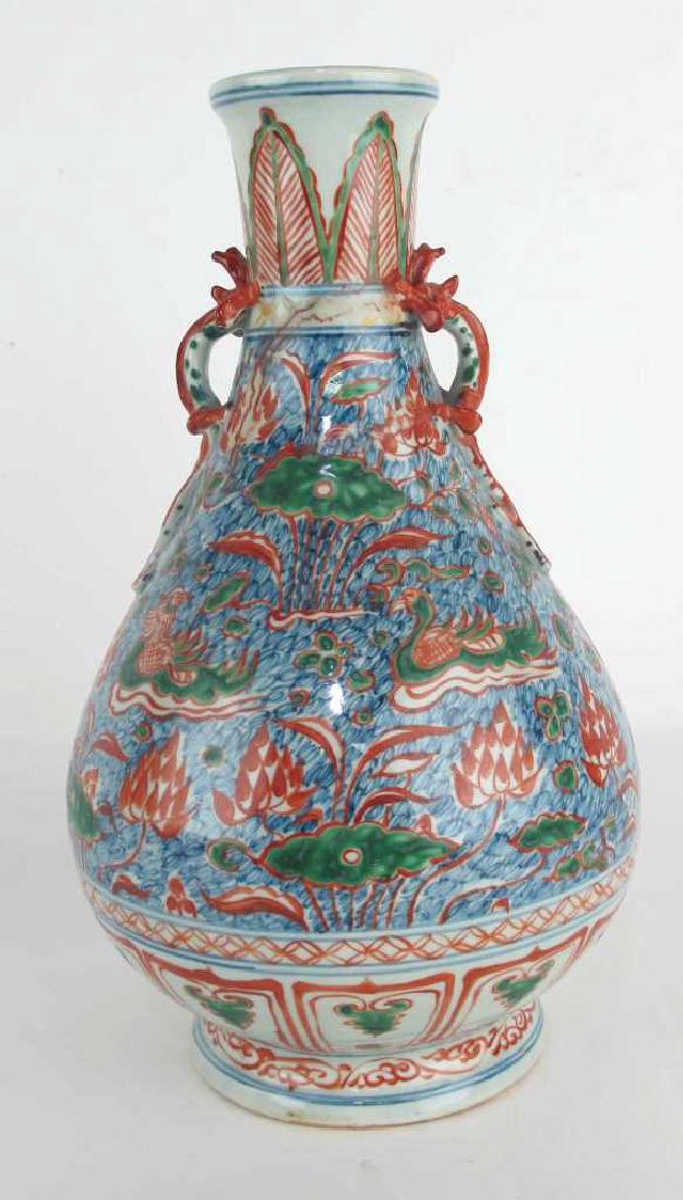 SoldAntique Chinese Export Porcelain VaseAntique Chinese Export Porcelain Vase Multi-colored decorated porcelain with elephant mask handles. Dimensions: 11 1/2"H X 7"W X 5"D. Condition: Minor glaze chips. A fill in chip and a repaired fill iSee Sold Price