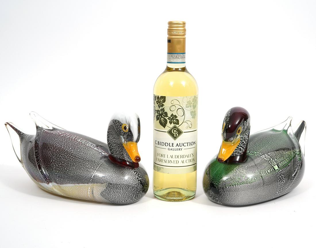 2 Murano Silver Infused Blown Glass Ducks