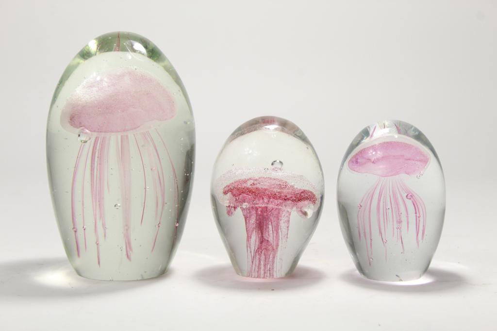 SoldMURANO STYLE ART GLASS PAPERWEIGHT W JELLYFISHMURANO STYLE ART GLASS PAPERWEIGHT W/ 3 SUSPENDED JELLYFISH -VERY GOOD PRE OWNED CONDITION -APPROX 6" X 4" -ART GLASS PAPERWEIGHT FEATURING THREE SUSPENDED BLUE JELLYFISH WITH TRAILING TENTACLES AND BSee Sold Price