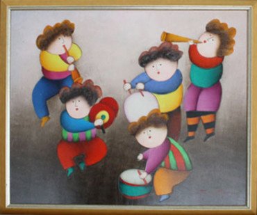SoldJ Roybal Five Musicians Oil Painting Signed Painting of five musicians in colorful clothes playingPainting of five musicians in colorful clothes playing flutes, bass, tuba, and violin. Signed in the right bottom corner. Artwork with frame is 16 1/2 X 13 3/4 inches in size.See Sold Price
